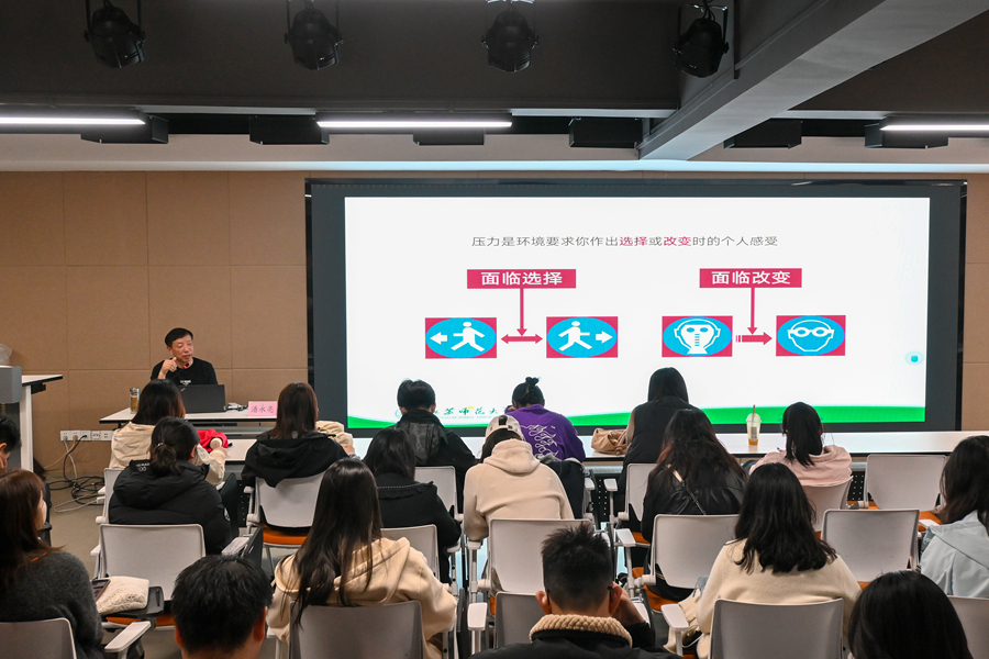 在地理测绘与城乡规划学院,校关工委社区宣传组组长潘永亮的《高校学生干部的心理自助与助人》专题培训,聚焦学生干部的心理素质提升。他引入世界卫生组织“四维健康”概念,通过“压力诊断”互动,传授“压力管理三部曲”。